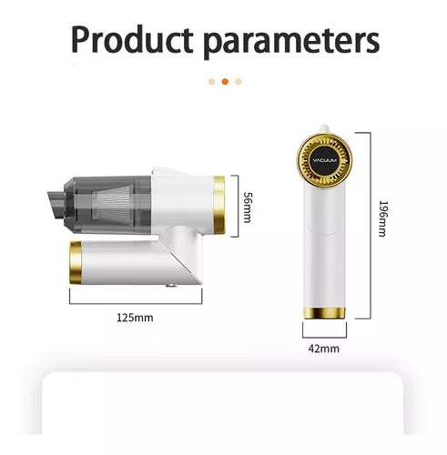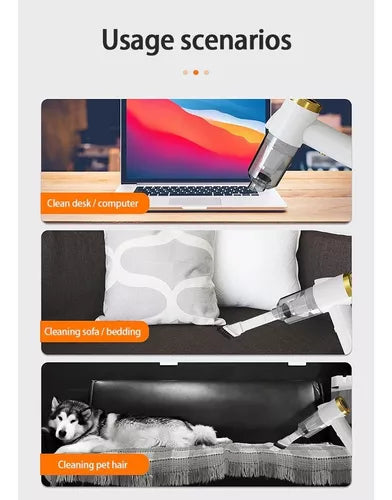 Material: ABS + PCEntrada: 5V/APotencia: 120WSucción: aproximadamente 9000PaContenedor de recolección de polvo: 120mlTiempo de Trabajo: aproximadamente 30 minutosTiempo de carga: aproximadamente 4 horasEspecificaciones:Aspiradora inalámbrica de mano para coche, de doble uso para coche y hogar. Equipado con luces LED para iluminar la oscuridad, para que el polvo no tenga dónde hacerlo, succión fuerte de 9000Pa, una succión es más limpia, plegado libre de 90 grados, almacenamiento conveniente, equipado con una interfaz de extensión, boquilla de succión tres en uno (boquilla ancha, boquilla de cepillo, boquilla plana), adecuada para cada esquina.Las imágenes pueden ser ilustrativas ¡¡¡POLITICAS DE GARANTIA!!!Las garantías serán validadas por defectos de fábrica o mal funcionamiento de los equipos despachados. ¿Tu producto tiene alguna novedad que debamos reportar? Una vez que recibas tus productos, cuentas con un máximo de 3 días para reportar a soporte: piezas faltantes, rotos, desperfectos y/o cualquier novedad que se detecte en producto que se considere importante.¡¡¡LEY DE RETRACTO!!!Si se devuelve un producto, este debe estar en las mismas condiciones en las que fue recibido (sin uso, sin daños, con empaques originales, etc.). NO debe ser abierto si el producto es abierto pierde la validez para ser devuelto.