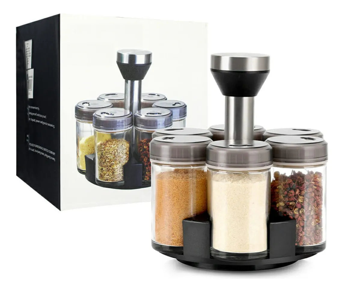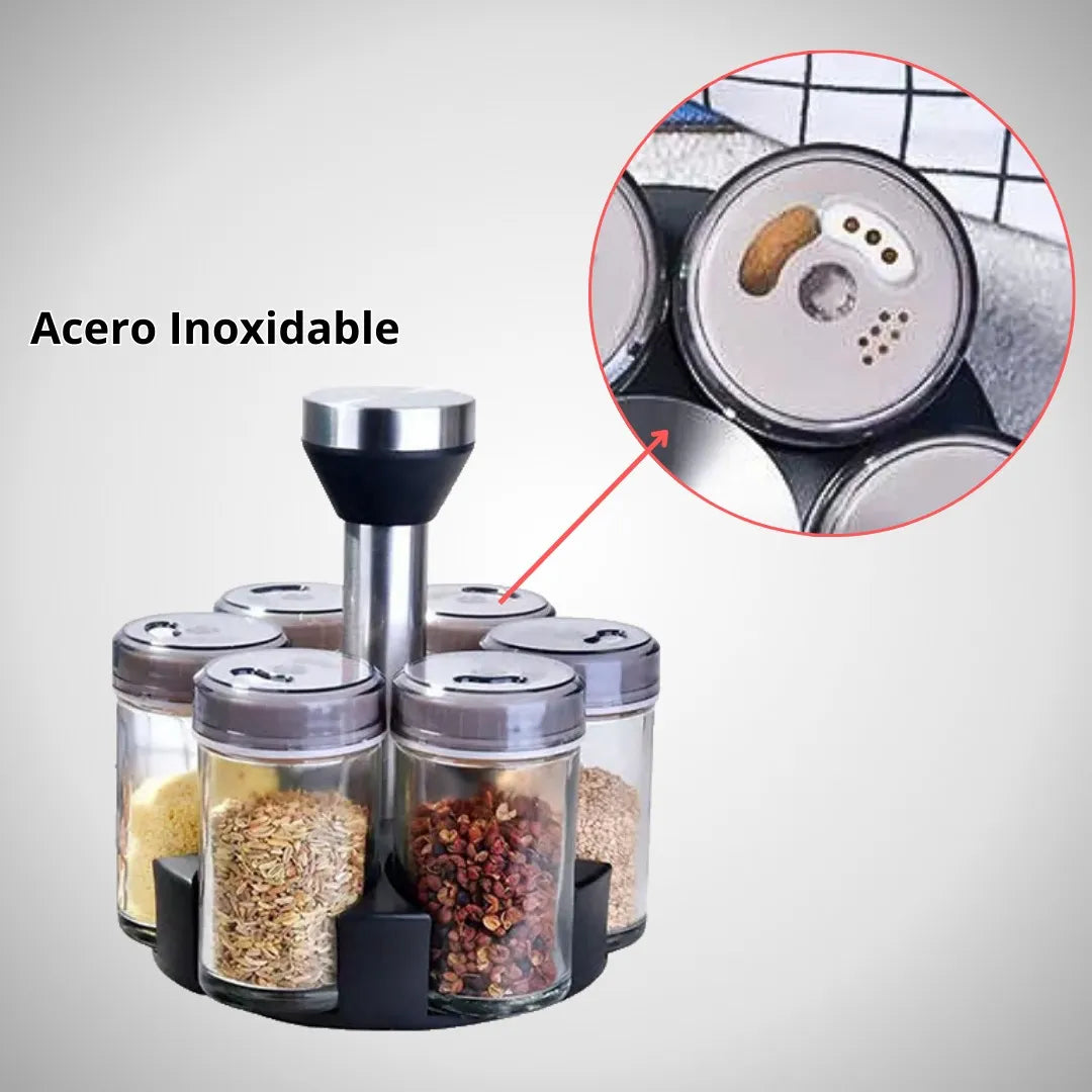 Condimentero Especiero En Vidrio Con Base Giratoria X6 Frascos Con CucharaMantén tu cocina limpia y ordenada, con este set giratorio ya no necesitas organizar los condimentos perfectamente en una fila, solo tienes que poner el condimento en el soporte giratorio después de su uso, girar el soporte para encontrar el condimento que deseas la próxima vez, ahorrando tiempo y esfuerzo.