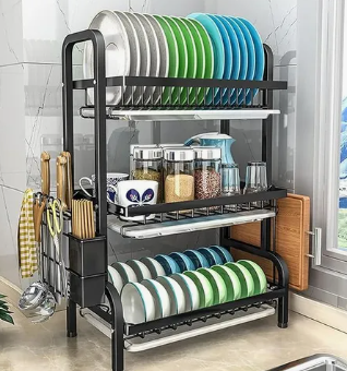 Escurridor de trastes - Dimensiones aproximadas de 42 L x 23,5 W x 61 H (cm). Incluye rejilla principal de tres capas, soporte para palillos, rejilla para cuchillos y rejilla para tabla de cortar. Capacidad para almacenar platos, vajillas, botellas de condimentos, tablas de cortar, cuchillos y otros utensilios de cocina.Estructura escurridor - Diseño en forma de T con barra de soporte gruesa y pies giratorios ajustables en la parte inferior para controlar la altura y proporcionar estabilidad, evitando balanceo. Capacidad de soporte de hasta 120 libras.Escurridor de trastes acero inoxidable - Acabado con pintura de poliéster para hornear, ofreciendo protección multicapa, resistencia al desgaste y a la suciedad. Superficie de pintura lisa y resistente a la decoloración.Escurridor de trastes fácil limpieza - Rejilla del tazón curvo desmontable para una limpieza sencilla. Cada capa cuenta con una bandeja receptora de agua de material pp, evitando ensuciar la encimera.Libere espacio en la cocina - Diseño vertical que permite almacenar una mayor cantidad de vajilla, optimizando el espacio y contribuyendo a un entorno más organizado.